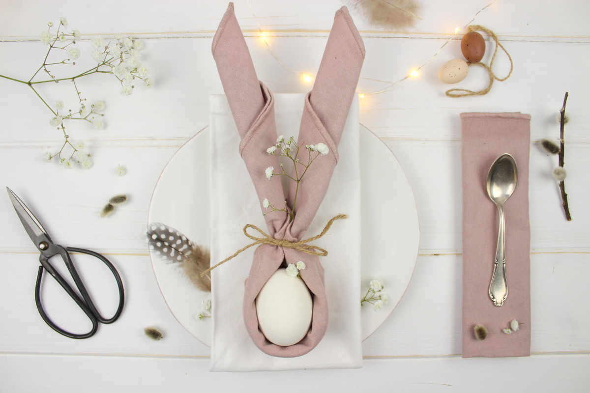Passend zur Tischdeko habe ich im letzten Jahr auch Servietten zu kleinen Hasenohren gefaltet. Diese einfache Osterdekoidee war übrigens auch eine von euren liebsten Anleitungen im letzten Jahr. Die DIY-Anleitung findet ihr >>hier<<!
